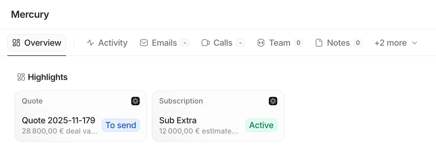 Leverage Attio's capabilities by displaying a company's quotes and subscriptions dynamically in the Highlights. Display Hyperline information in sections, and get a visibility of your customers' billing status with a customised granularity.