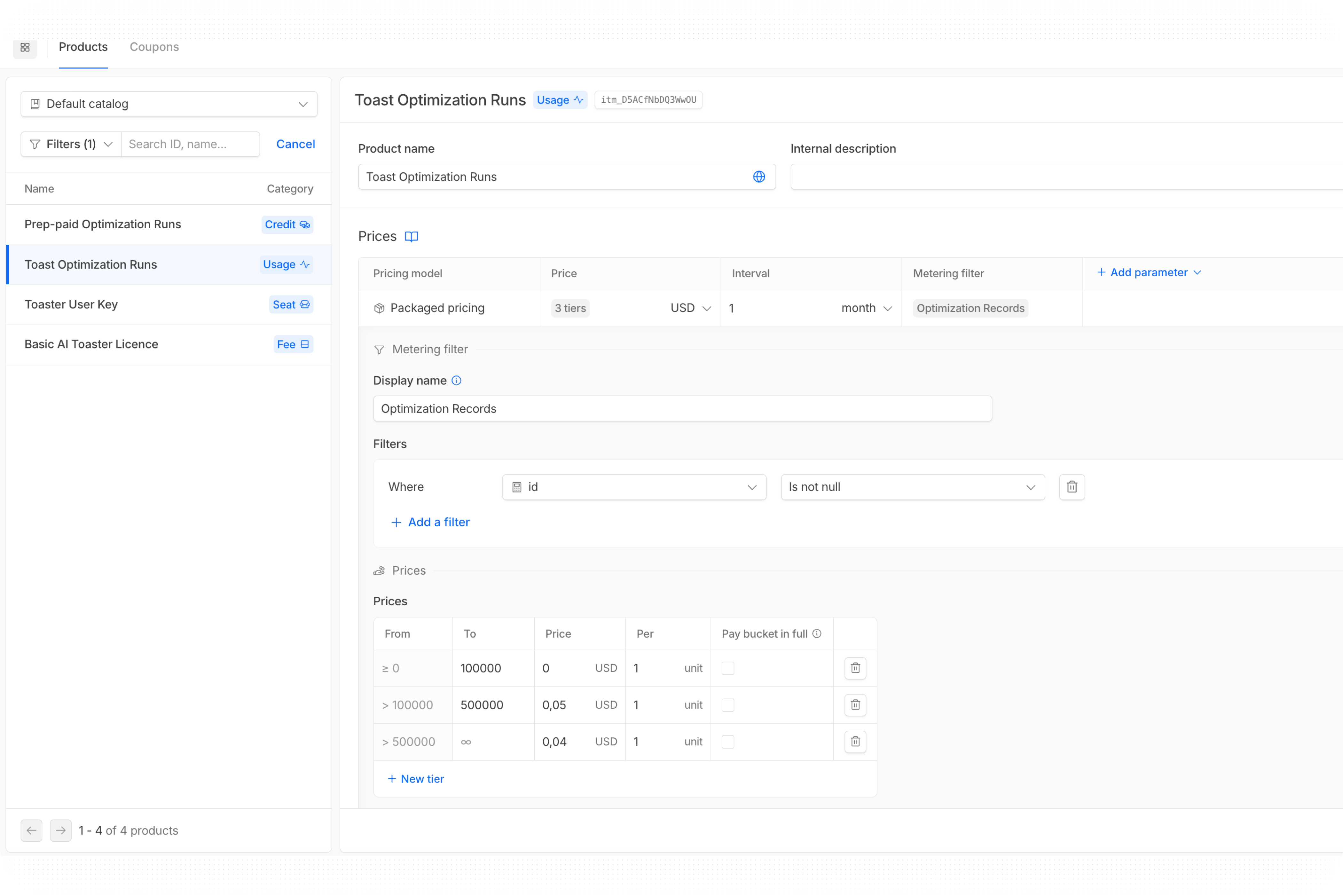 Usage-based pricing tied to measurable consumption. Meter events, apply tiers, and bill customers based on actual usage.